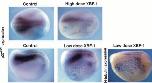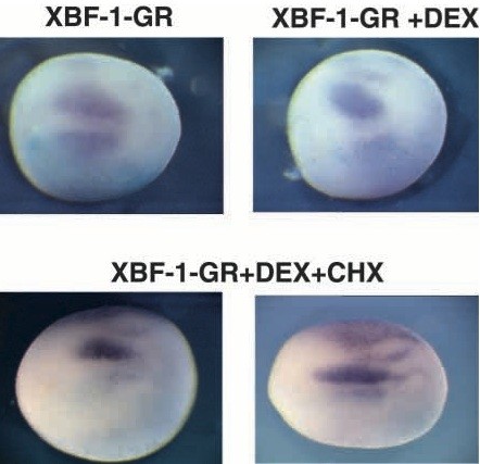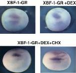 Fig. 9. p27XIC1 is a direct target of XBF-1. Dexamethasone-inducible XBF-1 RNA suppresses p27XIC1 in the presence (bottom panels) and absence (top right) of the protein synthesis inhibitor, cycloheximide. In the absence of both dexamethasone and cycloheximide, XBF-1- GR did not suppress p27XIC1 expression (top left panel).