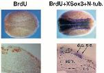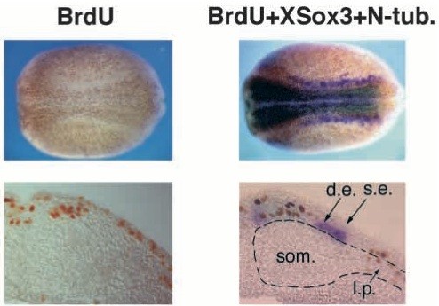 Fig. 3. XSox3 and N-tubulin expression marks proliferating and post- mitotic neural cells, respectively. Embryos were processed either for BrdU incorporation alone (left panels) or simultaneously for BrdU incorporation, XSox3 (light blue or green) and N-tubulin (magenta) expression (right panels), as described in Materials and Methods. Top panels show the whole mounted embryos and the bottom panels the respective transverse sections. XSox3 expression overlaps with BrdU incorporating cells while N-tubulin is expressed in cells that do not incorporate BrdU. Note that the deep layer of the epidermal ectoderm is also heavily dividing at this stage. A dotted line demarcates the underlying somitic and lateral plate mesoderm. d.e., deep layer of the ectoderm; l.p., lateral plate mesoderm; s.e., superficial layer of the ectoderm; som., somitic mesoderm.