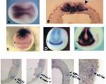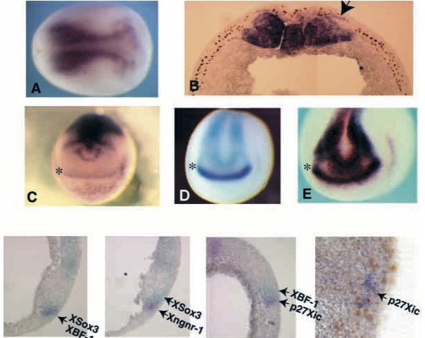 Fig. 5. p27XIC1 is normally expressed in non-dividing cells. Expression of XBF-1 in the anterior neural plate coincides with the expression of XSox3, but not that of p27XIC1. Neural plate-stage embryos were analysed for the expression of p27XIC1 (A-C). The sectioned embryo (B) was also labelled for BrdU incorporation (brown nuclear staining). p27XIC1 is expressed in non-BrdU incorporating cells both in the mesoderm and in the neural ectoderm (B, arrow). In the anterior neural plate (C), p27XIC1 was expressed in a band in a similar region to that of XBF-1 (D) and XSox3 (D,E) (marked by asterisks; D, XBF-1 in purple and XSox3 in light blue and E, XSox3 only in purple/brown). (Lower panels) Sections of double in situ hybridisations in light blue and purple, showing that XSox3 and XBF-1 are largely coexpressed and that p27XIC1 is expressed more rostrally than XBF-1 in a more comparable region to that of neurogenin, X-ngnr-1. p27XIC1 was expressed in BrdU negative cells in the anterior neural plate (bottom right panel).