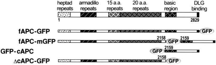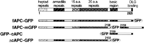 Figure 1. Structures of GFP fusion proteins with full-length APC and deletion mutants of APC. Xenopus APC (2829 aa) was tentatively divided into two portions: COOH-terminal (aa 2159–2829) and the remaining portions (aa 1–2158). Based on these portions, two deletion mutants of APC were constructed and fused with GFP. The numbers indicate the amino acid positions.