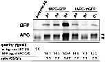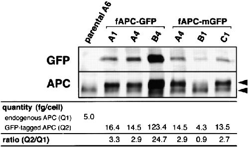 Figure 2. Expression levels of endogenous APC and exogenous GFP-tagged full-length APC. To separate the band of endogenous APC (lower arrowhead) from that of exogenous GFP-tagged APC (upper arrowhead), cell lysates of parental A6 cells and stable clones (A1, A4, and B4 for fAPC-GFP–expressing transfectants, and A4, B1, and C1 for fAPC-mGFP–expressing transfectants) were preincubated with λ-protein phosphatase followed by SDS-PAGE and immunoblotting with anti-GFP pAb (GFP) or anti-APC mAb, APC(Ab-1), (APC). In each lane, the cell lysate from 1 × 106 cells was applied. The amount of endogenous APC in parental A6 cells (Q1) and GFP-tagged APC in stable clones (Q2) were quantified as described in Materials and Methods, and their Q2/Q1 ratios were calculated.
