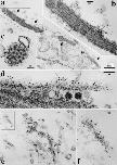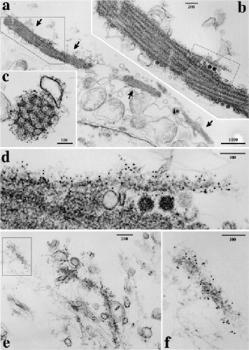 Figure 4. Immunolabeling of fAPC-GFP aggregates with anti-GFP pAb in A6 transfectants at the electron microscopic level. A6 transfectants expressing large amounts of fAPC-GFP (clone B4; see Fig. 2) were permeabilized with digitonin and incubated with rabbit anti-GFP pAb, followed by incubation with 5-nm gold-conjugated anti-rabbit IgG pAb. Abnormal thick bundles of MTs were occasionally observed (arrows in a). Boxed areas in a, b, and e were enlarged in b, d, and f, respectively. Both longitudinal (b) and transverse (c) sectional images of these thick MT bundles revealed that in these bundles, MTs were embedded in fuzzy matrices, which were directly labeled with anti-GFP pAb. Single microtubules surrounded by immunolabeled fuzzy structures were also occasionally observed (d–f). Note that no membranous vesicles were labeled with immunogold particles. Bars: (a) 1,000 nm; (b and e) 200 nm; (c, d, and f) 100 nm.