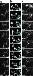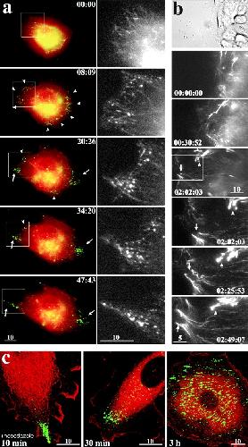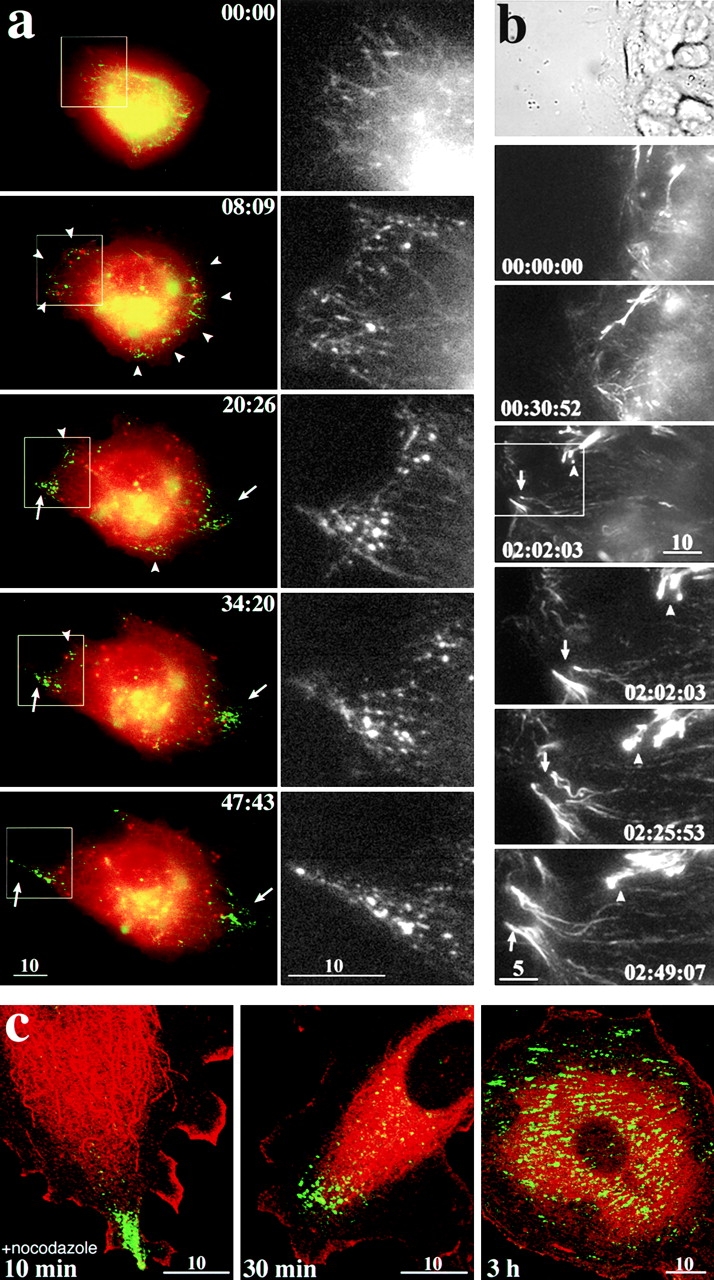 Figure 5. The behavior of full-length APC in live cells (clone C1; see Fig. 2) during cell spreading and wound healing. (a) A6 transfectants stably expressing fAPC-mGFP were replated on glass-bottomed dishes, and a series of fluorescence microscopic images were obtained. The aggregates of fAPC-mGFP were visualized as green fluorescence. Plasma membranes of these cells were labeled with PKH26 in red (some endocytotic vesicles were also labeled in red). Cells were replated 1 h after trypsinization and recording of the images was started 15 min after replating. Only the GFP signal in boxed areas in color plates were selected in corresponding black-and-white plates at larger magnification. See details in the text. Elapsed time was indicated at top right (in min:s). QuickTime video is available at http://www.jcb.org/cgi/content/full/148/3/505/DC1. (b) Confluent cultures of A6 transfectants expressing fAPC-mGFP were manually scratched with sharp needles. The top panel shows a phase-contrast image of cells at the edge of the wound shortly after wounding. Second to fourth panels (times 00:00:00–02:02:03) show fluorescence images of fAPC-mGFP with the same scale and position as the top phase-contrast panel. Fifth to last panels (times 02:02:03–02:49:07) show a series of magnified images of the boxed area in the fourth panel. See details in the text. Elapsed time is indicated at the bottom (in h:min:s). (c) A6 transfectants expressing fAPC-mGFP were incubated with 33 μM nocodazole to disassemble MTs for 10 min, 30 min, and 3 h, then fixed and immunofluorescently stained with anti-tubulin mAb in red. The fAPC-mGFP was visualized as green fluorescence. See details in the text. Bars: (a, b, top, and c) 10 μm; (b, bottom) 5 μm.