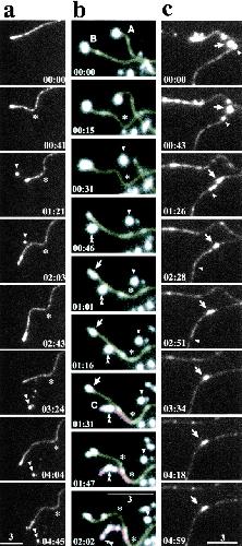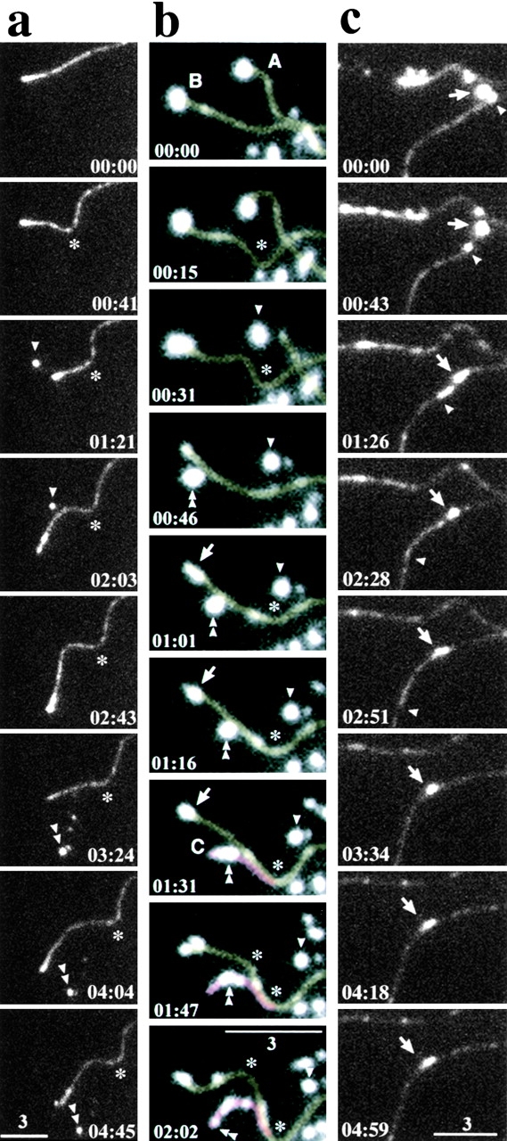 Figure 6. The behavior of full-length APC in live cells at the distal ends of MTs. (a and b) A series of time-lapse images was obtained from a thin lamella of a A6 cell expressing fAPC-GFP (clone A1; see Fig. 2) or fAPC-mGFP (transient expression), respectively. In these thin lamellae, individual MTs were spread out toward the leading edge of the cell, which was directed to the left. Since GFP-tagged molecules were not only concentrated at the distal ends of MTs but also evenly covered individual MTs, imaging only by GFP fluorescence allowed us to observe the dynamic behavior of fAPC-GFP/fAPC-mGFP as well as MTs simultaneously. Asterisks and arrowheads indicate the rearward movement of the bending points of MTs and the granules dropped off from shortening MT ends, respectively. See details in the text. Microtubule-A/B and -C in b were colored in yellow and pink on the computer, respectively. (c) Another series of time-lapse images of clone B4 (see Fig. 2) showing the continuous flow of fAPC-GFP along MTs (arrows and arrowheads) toward their distal ends. This continuous flow is clearly visualized in the video. In a–c, elapsed time is indicated at bottom (in min:s). QuickTime videos for a–c are available at http://www.jcb.org/cgi/content/full/148/3/505/DC1. Bars: 3 μm.