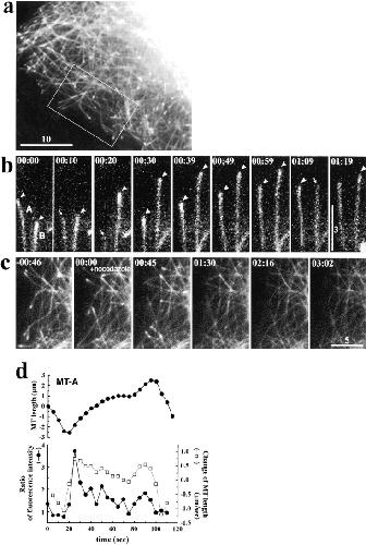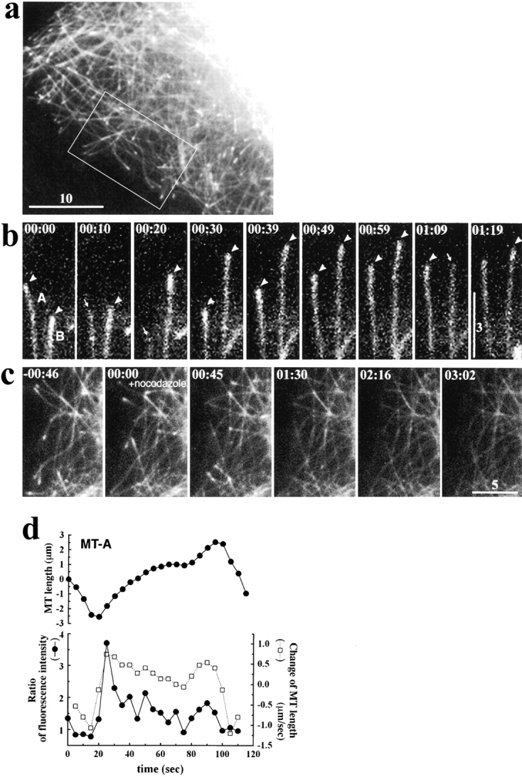 Figure 7. The behavior of the COOH-terminal region of APC in live cells. A6 cells transiently expressing GFP-cAPC (see Fig. 1) were observed. (a) In A6 cells expressing relatively low level of GFP-cAPC, GFP-cAPC was distributed along the entire length of all MTs, but was significantly concentrated at the distal ends of MTs. (b) The dynamic behavior of GFP-cAPC at the distal ends of two MTs (A and B) in the lamellae, which was directed to the top. Only when these MTs continued to grow, the distal ends of MTs were highlighted by the GFP signal (arrowheads). When MTs were switched from growth to shortening phase, the GFP-cAPC concentrated at ends of MTs abruptly disappeared (arrows). (c) Effects of low concentration of nocodazole (100 nM), which affects the assembly/disassembly dynamics of MTs at their plus ends without changing their polymer mass, on the behavior of GFP-cAPC at the ends of MTs. The boxed area in a was enlarged in c. Within 1-min incubation with nocodazole, the concentration of GFP-cAPC at MT ends became undetectable, leaving evenly distributed GFP-cAPC along the entire length of MTs. (d) Quantitative analyses of the relationship between the length of MT-A and the degree of concentration of GFP-cAPC on their ends in b. The upper panel is a plot of MT length and the lower panel represents changes of MT length (open squares; right-hand scale) and the ratios of fluorescence intensities between the MT end and the proximal segments (closed circles, left-hand scale; see Materials and Methods). This quantification clearly showed the specific association of the GFP-cAPC concentration with growing MTs but not with shortening MTs. Elapsed time is indicated at top left (in min:s). Bars: (a) 10 μm; (b) 3 μm; (c) 5 μm. QuickTime videos for b and c are available at http://www.jcb.org/cgi/content/full/148/3/505/DC1.