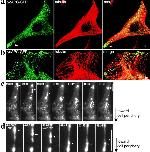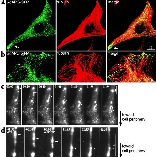 Figure 8. Subcellular distribution and the behavior of the deletion mutant of APC lacking its COOH-terminal region in A6 transfectants. (a and b) A6 cells expressing ΔcAPC-GFP (see Fig. 1) were fixed and stained with anti-tubulin mAb in red. Expressed ΔcAPC-GFP formed granular structures (green) with various diameters scattered around the cytoplasm. These granules occasionally clustered in the tip region of some, but not all, of the cellular extensions (arrows in a). In thin lamellae (b), these granules were shown to be aligned along MTs (arrowheads in b). (c) A series of time-lapse fluorescence images was obtained from cellular extensions of live A6 cells expressing ΔcAPC-GFP. Since, differently from fAPC-mGFP and GFP-cAPC, ΔcAPC-GFP did not decorate MTs, MTs were not visible in these images. A large granule moving linearly toward the cell edge is indicated by an arrowhead. A QuickTime video is available at http://www.jcb.org/cgi/content/full/148/3/505/DC1. (d) Movements of the ΔcAPC-GFP granules in permeabilized cells. A6 cells expressing ΔcAPC-GFP were replated, cultured for 4 h, and then permeabilized with digitonin in the presence of 10 μM taxol. Addition of 0.2 mM ATP induced linear movements of the granules toward the cell periphery (times −01:50–01:45, arrows). Further addition of 1 mM AMP-PNP at time 00:00 blocked these movements (times 01:45–05:35, arrowheads). Elapsed time is indicated at top left (in min:s). Bars: (a and b) 10 μm; (c) 5 μm; (d) 3 μm.