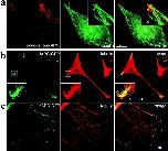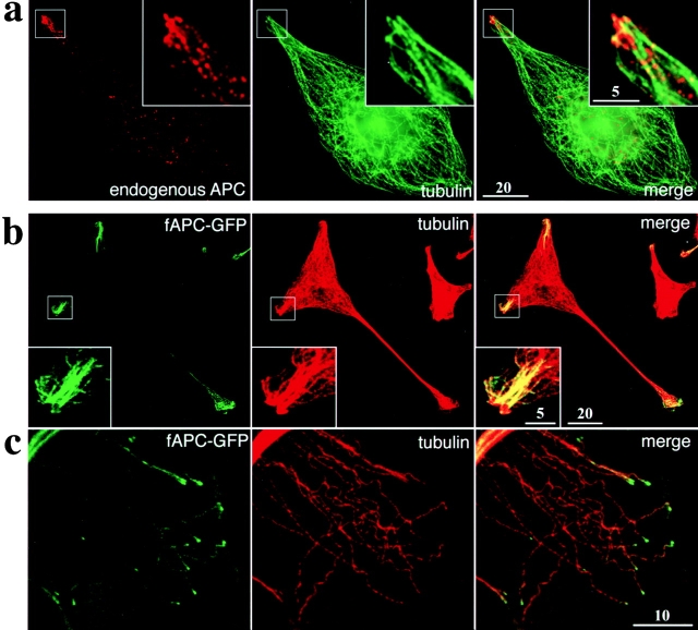 Figure 3. Subcellular distribution of endogenous APC and GFP-tagged full-length APC in stable A6 transfectants. (a) Parental A6 cells were double stained with anti-APC pAb (red) and anti-tubulin mAb (green), and observed with DeltaVision microscope. (b and c) A6 transfectants expressing fAPC-GFP (clone A1; see Fig. 2) were fixed and immunofluorescently stained with anti-tubulin mAb, and observed by confocal microscopy. Expressed fAPC-GFP and MTs were visualized as green and red fluorescence, respectively. In b, fAPC-GFP was concentrated at the tip regions of some cellular extensions, where fAPC-GFP was associated with MTs to form thick bundles (inset). In thin lamellae (c), where MTs spread out toward the cellular edges (toward right), fAPC-GFP was visualized as granules on the distal ends of individual MTs. Note that the subcellular distribution of fAPC-GFP in b was very similar to that of endogenous APC in a. Bars: (a and b) 20 μm; (c) 10 μm; (insets) 5 μm.