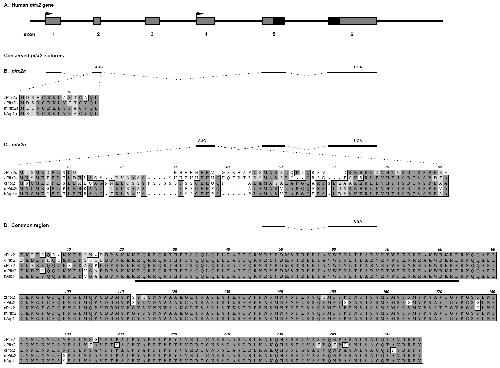zebrafish isoforms suggests a genomic structure similar to that in humans. Black boxes represent regions encoding homeodomain. (B) The