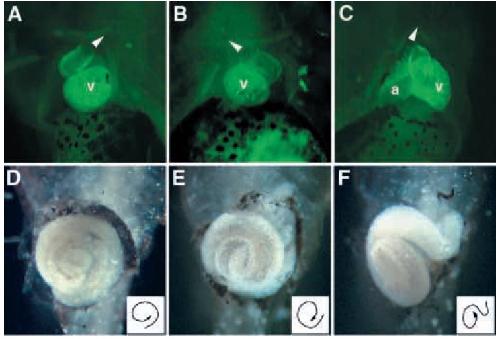 (B) Reversed heart in an embryo injected with pitx2a DNA.