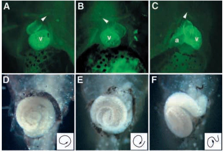 atrium, v, ventricle. (D) Normal coiling of the gut in a uninjected