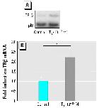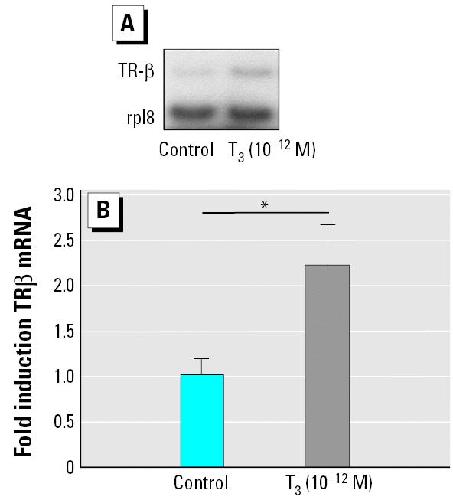 Figure 2. Induction of TR-β expression by a weak T3 pulse. To evaluate the effect of the pretreatment protocol on TR-β expression, tadpoles were exposed for 6 hr to 10â12 M T3. Total RNA was extracted from caudal muscles and used for RT-PCR analysis of TR-β expression. Rpl8 was used as the internal control. (A) Typical scan obtained after 22 cycles of PCR amplification. (B) Same results quantified by Phosphoimager scanning (Molecular Dynamics, Sunnyvale, CA, USA). Values shown are mean ± SE of five independent experiments expressed as multiples of induction, where 1 is equal to expression in the absence of T3 (untreated tadpole; Rpl8) as the control level. For each sample, densitometry readings were normalized against the value for Rpl8.*p < 0.05.