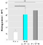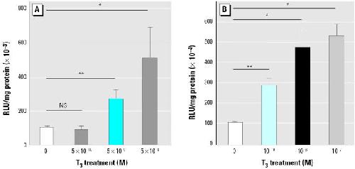 Figure 3. Action of TH agonists assessed using the somatic gene transfer method and pretreatment. Tadpoles were pretreated 24 hr with 10â12 M T3 and then rinsed and fed during 24 hr before injection of 200 ng TH/bZIP-luc construct in the caudal skeletal muscle. TH/bZIP-luc transcription was measured in injected tadpoles exposed to 5 à 10â8 M T3 or 5 à 10â8 M TRIAC for 48 hr. Values shown are mean ± SE (n = 12/group). Each experiment was repeated three times, providing similar results.*p < 0.05. ** < 0.01.