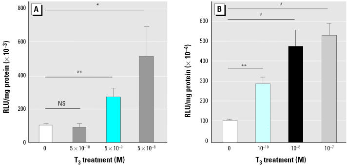 Figure 4. Dose dependency of TH effects on transcriptional responses. NS, not significant. (A) Transcriptional response in tadpoles pretreated for 24 hr with 10â12 M T3 and then rinsed and fed during 24 hr before injection of 200 ng TH/bZIP-luc construct in the caudal skeletal muscle. The TH/bZIP-luc transcription was measured in injected tadpoles exposed or not exposed to 5 à 10â8 M, 5 à 10â9 M, or 5 à 10â10 M T3 for 48 hr. (B) Transcriptional response in tadpoles injected with 500 ng TH/bZIP-luc construct in the brain, pretreated 24 hr with 10â12 M T3, and then rinsed and fed during 24 hr before exposure to 10â7 M, 10â8 M, or 10â10 M T3. TH/bZIP-luc transcription was measured after 48 hr. Values shown are mean ± SE (n = 12/group). Each experiment was repeated three times, providing similar results.*p < 0.05. **p < 0.01. #p < 0.001.