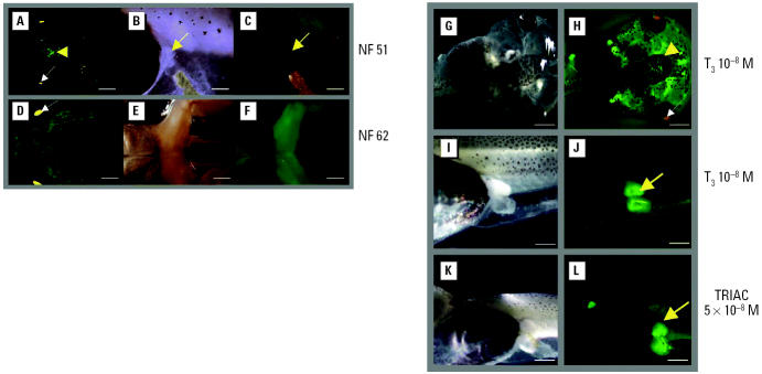 Figure 5. (A–F) Transcription responses of the TRE-containing transgene to endogenous TH induced by natural metamorphosis in germinally transgenic F0 embryos at NF stages 51 (A–C) and 62 (D–F). (A, D) Brain. (B–F) Limb buds. TH/bZIP-eGFP is expressed first in the brain (A, yellow arrowhead) and then in other tissues, and persists throughout larval development (A, D). No fluorescence above background is present in limb buds at NF stage 51 (C, yellow arrow). The signal increases throughout larval development until metamorphosis is reached (NF stage 62), when it increases strongly (F). Bars = 1.6 mm (A); 0.5 mm (B, C); 1.8 mm (D); 1.7 mm (E, F).(G–L) The pretreatment protocol significantly reduced time for response to T3 and to TH analogues in TH/bZIP-eGFP transgenic F0 tadpoles (G, H, head; I–L, hindlimb). Tadpoles were pretreated for 24 hr with 10−12 M T3 at NF stages 51–52, and then rinsed and fed during 24 hr before being exposed to 10−8 M T3 (J) or to 5 × 10−8 M TRIAC (L). Fluorescence in the CNS (H) and in hindlimb buds (J, L) was observed after 2 days of treatment. Yellow arrows indicate limb buds; arrowhead indicates the brain area. White arrows indicate crystallin-RFP expression in the eye. Bars = 2 mm (G, H); 0.8 mm (I–L).