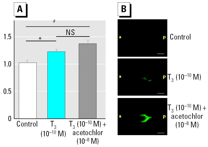 Figure 6. The TH enhancing activity of the pesticide acetochlor revealed in the brains of germinally transgenic premetamorphic tadpoles. Abbreviations: a, anterior; NS, not significant; p, posterior. (A) NF stage 50â52 germinally transgenic tadpoles bearing a TH/bZIP-eGFP transgene were pretreated for 24 hr with 10â12 M T3 and then rinsed and fed for 24 hr.Fluorescence was measured in tadpole brains after 48 hr exposure to 10â10 M T3 or to 10â10 M T3 plus 10â8 M acetochlor. Values shown are mean ± SE of three experiments expressed as multiples of induction, where 1 = control expression in the absence of T3. Data were normalized and analyzed by Studentâs t-test. (B) Representative photographs of strongly fluorescent tadpoles brain from each group (n = 15 tadpoles per group). Bars = 0.4 mm.*p < 0.05. #p < 0.001.
