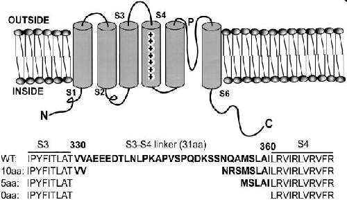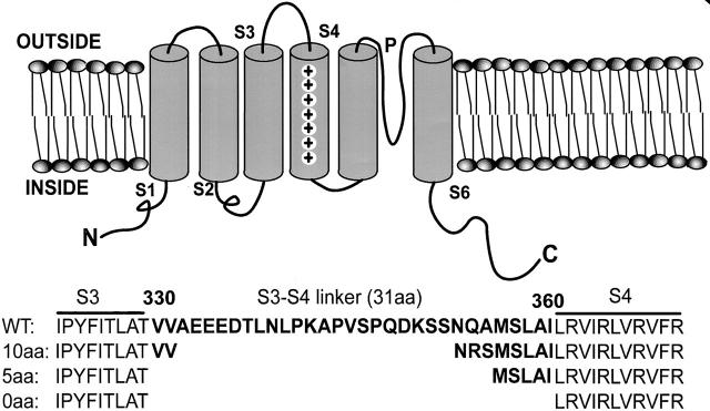 Figure 1. Mutations of the Shaker S3–S4 linker region. The wild-type Shaker sequence (top) is compared with the mutations studied here. The S3–S4 linker was defined according to Wallner et al. 1996. The asparagine-arginine-serine sequence in the 10 aa linker channel corresponds to the S3–S4 linker region present in the human calcium-activated K+ channel (hSlo; Wallner et al. 1996).
