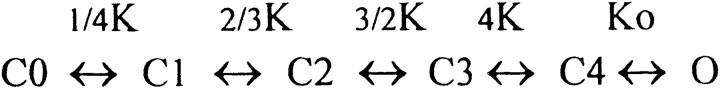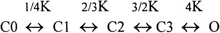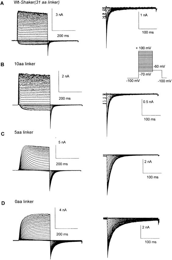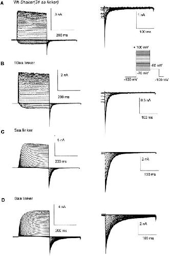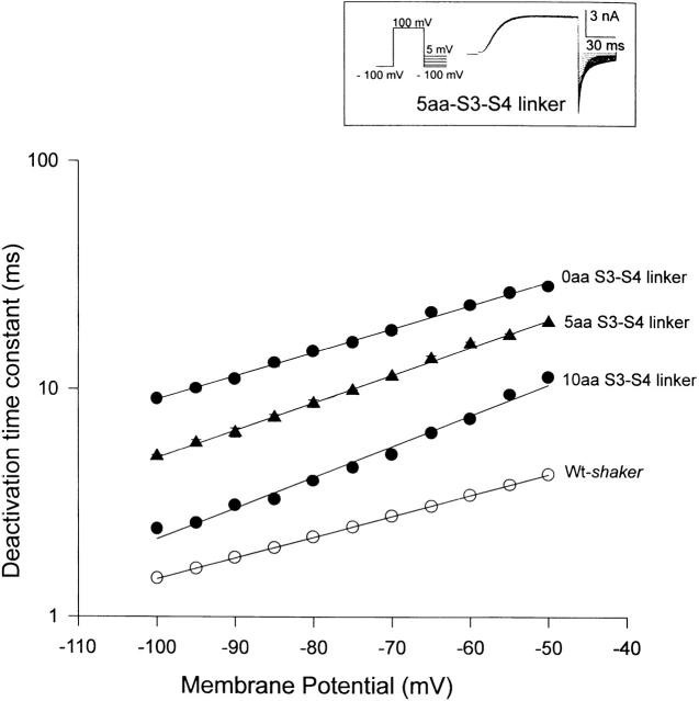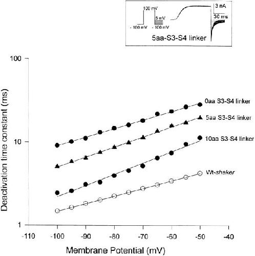 Figure 5. The time constants of current deactivation were obtained by fitting the tail currents after a 250-ms activating pulse to 15 mV as indicated in the pulse protocol shown in the inset. Time course was fitted with a single exponential. Solid lines are fit to the data using τd = C exp(−ZV/RT), where τd is the deactivation time constant, C is a constant, and Ζ defines the voltage dependence of τd. The values of Z were: 0.53 ± 0.9, 0.8 ± 0.08, 0.58 ± 0.1, and 0.69 ± 0.08 for the WT, and 10, 5, and 0 aa linker mutants, respectively.