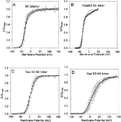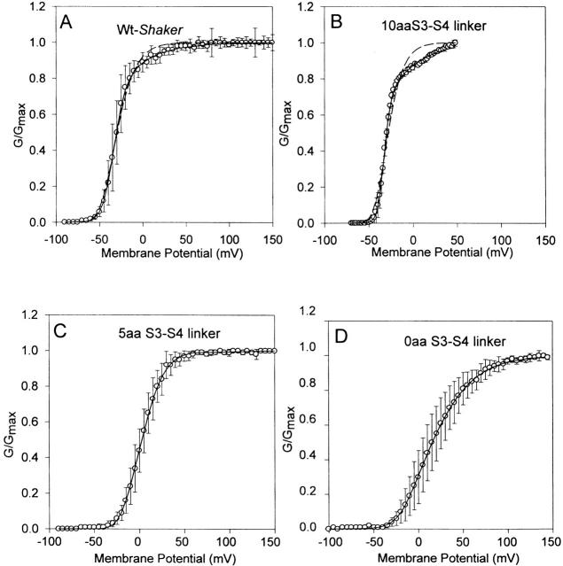 Figure 3. Deletions in the S3–S4 linker shift the G-V curves toward depolarizing voltages. Voltage dependence of activation of wild-type ShakerΔ and S3–S4 linker mutants. The conductance–voltage curves were obtained using tail current measurements. Each point is the average of determinations on 10–20 separate patches. Solid lines were drawn using parameters in Table and for the WT and 10 aa linker mutant, or for the 5 and 0 aa linker mutants. Dashed lines drawn for the WT and 10 aa linker mutant are the best fit to a fourth power Boltzmann function.
