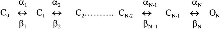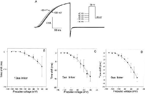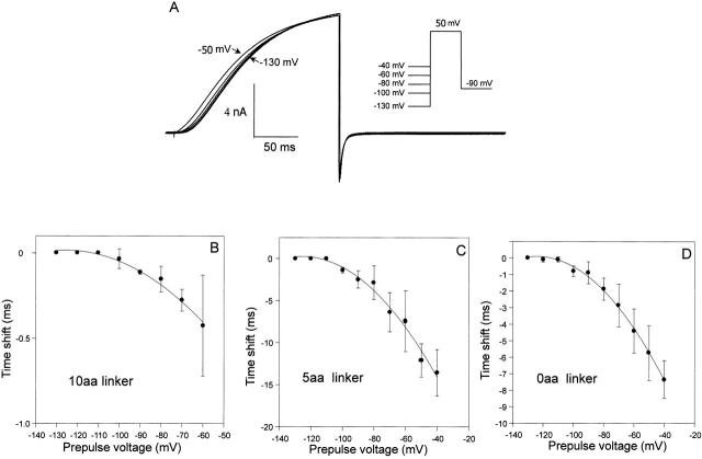 Figure 6. Kinetics of early transitions of the activation pathway using the Cole-Moore protocol. (A) Family of macroscopic ionic currents from 5 aa linker mutant channels elicited in response to the variable hyperpolarized prepulses shown in the pulse protocol followed by a 50-mV test pulse and a postpulse of −90 mV. The holding voltage was −90 mV. A P/−4 subtraction protocol was used. Data was filtered at 5 kHz and digitized every 100 μs. (B) Delay or time shift due to the hyperpolarized prepulses for the linker mutant channels calculated from current records was measured by displacing the current records along the time axis until the best superposition was obtained. Lines in these plots were drawn by eye.