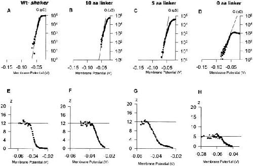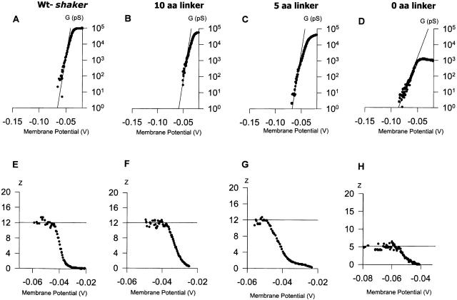 Figure 7. Limiting slope analysis in wild-type ShakerΔ and the S3–S4 linker mutant channels. (A–D) Semilogarithmic plot of the G vs. V relationship of the different mutants. The solid line indicates the fitting of the low probability data in order to determine the limiting value of z. (E–H) z vs. V plot of the corresponding mutants indicated above the A–D graphs. The solid line indicates the asymptotic value of z at very hyperpolarizing voltages obtained by the derivative with respect to the voltage of the monoexponential fit of the low probability data.