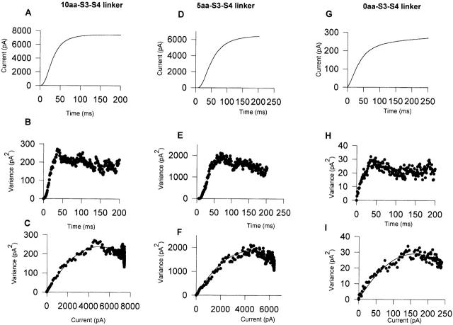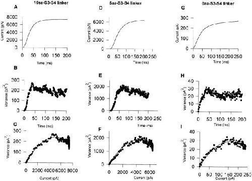 Figure 8. Variance analysis for three deletion mutants. (A,D, and G) Mean current traces obtained from 256 traces recorded with the patch technique from a holding potential of −100 mV to a test pulse potential of 120 mV. (B, E, and H) Time course of the variance. (C,F, and I) Variance versus current fitted to the function σ2= iI(t) − I(t)2/N (solid line). The mean maximum open probability (Pomax) among the different mutants was 0.75.