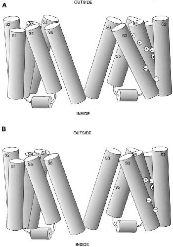 Figure 9. Model of the structure of all six segments of the Shaker K channel, which accounts for the observations described in the present study (Cha et al. 1999; Bezanilla 2000). (A) Two subunits facing each other across the pore are shown. This allows the observation of the back face of the left subunit and the front face of the right subunit. Only the open configuration of the channel is shown. In this model, depolarization rotates the S4 segment in 180°, and charges that were facing the intracellular solution by being in the crevice formed by S1 and S5 are displaced towards the extracellular solution remaining in a water-filled crevice formed by segments S2 and S3. This requires an S4 movement of no more than a few Angstroms and explains why a 5 aa linker allows for the movement of all the channel gating charges. (B) When the whole S3–S4 linker is removed, the S3 and S4 segments are closer together, decreasing the width of the crevice formed by the S2 and S3 segments. This has the effect of widening the region where the electric field falls, with the consequent decrease in zδ.