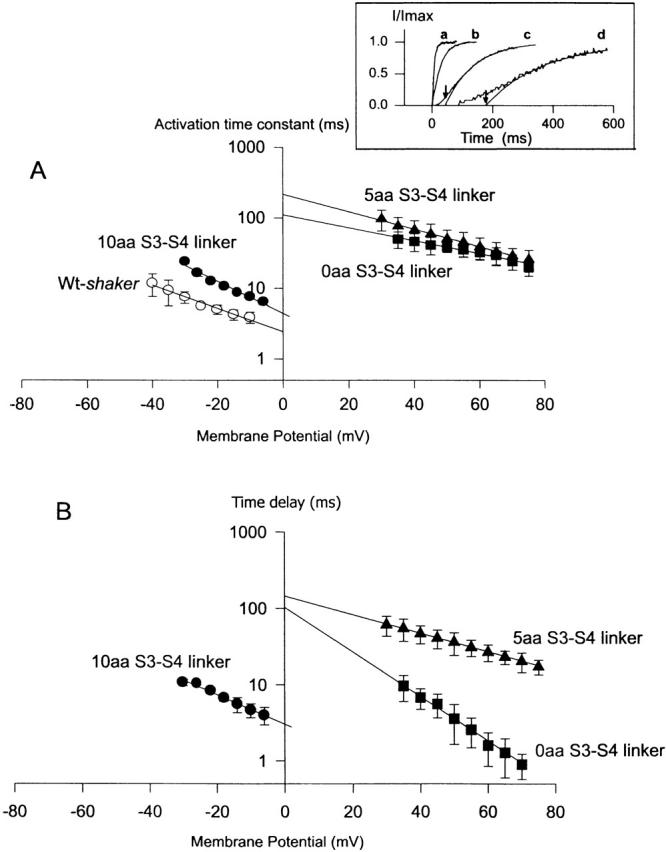 Figure 4. Activation kinetics become slower by deletions in the S3–S4 linker. (A) Channel activation was characterized by a fit of the time course of the current elicited by depolarization from a holding potential of −100 mV to and exponential function with a time constant τa and a time delay d (). Arrows in the inset show d for the 5 and 0 aa linker mutants. The fit started near the time at which current had reached ∼30–50% of the maximum (see inset). Arrows in the inset show d for the 5 and 0 aa linker mutants. The solid lines are fits to the data using an equation of the form: τa = A exp(−ZV/RT), where τa is the activation time constant, A is a constant, Z defines the voltage dependence of τa, and V is the voltage. Parameters A were 2.45 ± 0.74, 4.45 ± 0.25, 217 ± 65, and 111 ± 22 ms for the WT, and 10, 5, and 0 aa linker mutants, respectively. Parameters Z were 0.95 ± 0.35, 1.30 ± 0.03, 0.71 ± 0.08, and 0.53 ± 0.04 for the WT, and 10, 5, and 0 aa linker mutants, respectively. (B) Plots of the time delay d as a function of voltage. Lines were drawn using an equation of the form: d = A exp(−ZV/RT). Parameters A were 3.1 ± 1.1, 146 ± 53, and 103 ± 48 ms for the 10, 5, and 0 aa linker mutants, respectively. Parameters Z were 1.11 ± 0.10, 0.70 ± 0.05, and 1.68 ± 0.06 for the 10, 5, and 0 aa linker mutants, respectively.