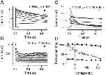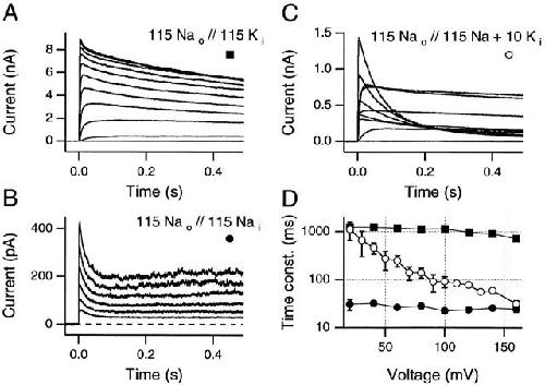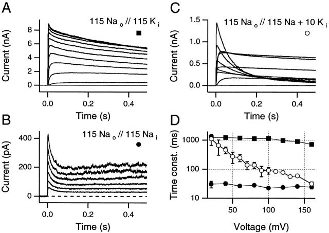 Figure 1. Slow inactivation rates can become steeply voltage sensitive when high Na+, low K+, internal solutions are used. (A) With 115 mM [Na+] externally and 115 mM [K+] internally, slow inactivation rate is essentially voltage insensitive for test potentials between +20 and +160 mV (traces shown: −20 to +160 mV, 20-mV steps, 5-s interpulse intervals). (B) Despite a marked increase in the rate of slow inactivation in symmetric Na+ solutions, the slow inactivation rate remains insensitive to the test potential (traces shown: +40 to +140 mV, 20-mV steps, 5-s interpulse intervals). (C) Slow inactivation is steeply voltage sensitive when 10 mM of K+ is added to the internal solution used in B (traces shown: −60 to +120 mV, 20-mV steps, 5-s interpulse intervals). (D) Time constants for all three conditions for test potentials from +20 to +160 mV. ▪, 115 Nao//115 Ki as in A (mean data from three to five patches). •, 115 Nao//115 Nai as in B (mean data from two to four patches). ○, 115 Nao//115 Nai + 10 Ki as in C (mean data from three patches, except at +160 mV, where n = 14 patches). Standard deviations are visible only when they exceed the size of the data symbol. All data are from inside-out patches.