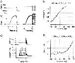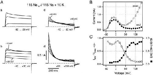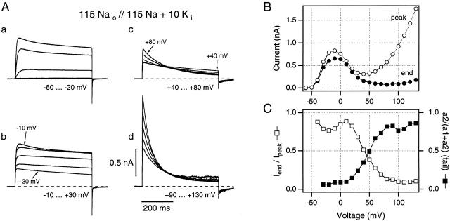 Figure 2. A family of macropatch currents recorded from ShΔ channels expressed in Xenopus oocytes, using a high [Na+], low [K+] internal solution. (A, a–d) Individual current traces are shown for groups of five test potentials to minimize the ambiguity produced by overlapping traces. (B) Peak current magnitudes (○) give an N-shaped peak I-V curve, while end currents (•) fail to increase at potentials greater than +20 mV, indicating steadily increasing slow inactivation in this 500-ms time window at these test potentials. (C) Iend/I peak (□) and the relative increase in magnitude of slow component of the tail current (▪) are plotted against the test potential to give quantitative estimates of steady state slow inactivation at these potentials. Symbols in B and C are connected by straight lines. All data are from the same inside-out patch as in Fig. 1 C. Traces recorded using 5-s interpulse intervals.