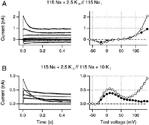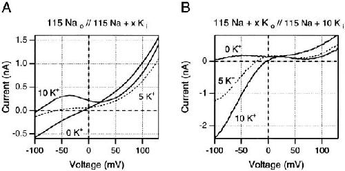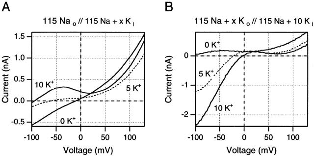 Figure 7. Effects of changes in K+ concentrations on ramp I-V curves after 5-ms test pulses to +160 mV (A) or +140 mV (B). (A) Effects of changes in internal K+ concentration in one inside-out patch. Note that the outward currents at positive potentials are highest in absence of internal K+ and fall when low K+ concentrations are added to the internal solution. (B) Effects of changes in external K+ in one outside-out patch. Changes in outward currents are small relative to the changes in inward currents at negative potentials. See text for full discussion of these results. Data in A are from one inside-out patch, data in B are from one outside-out patch.