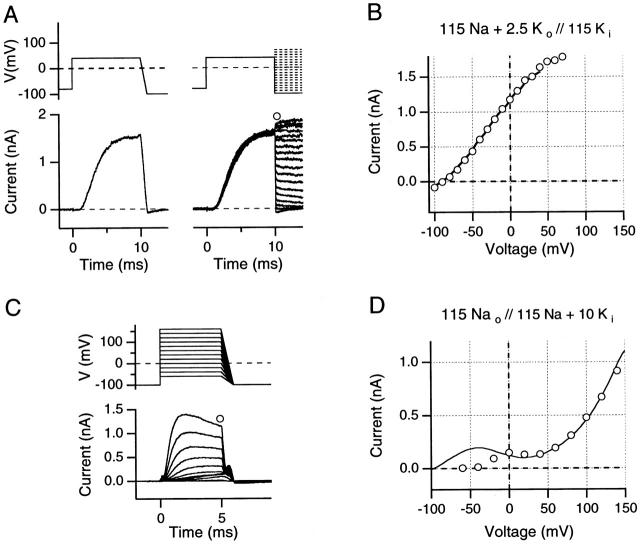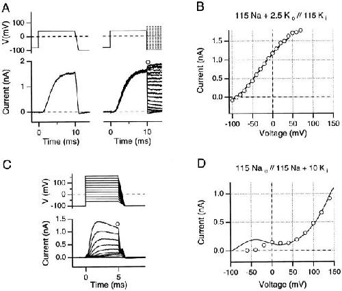 Figure 4. (A and B) Comparison of instantaneous I-V curves and reversal potentials obtained from 1-ms ramps and by the standard tail current method, evaluated in high internal K+ solution (A, top) The pulse protocols illustrate the 1-ms downward ramps from +40 as well as corresponding protocols for the recording of instantaneous tail currents. (Bottom) Ionic currents obtained from an outside-out patch using solutions indicated in B. Data were recorded with a sample interval of 10 μs, digitally low-pass filtered at 20 kHz. (B) Comparison of ramp I-V data from +40 mV to −100 mV (solid line) with instantaneous tail current I-V data (○) from the data shown in A. (C and D) Comparison of instantaneous I-V curves from 1-ms ramps with the N-shaped test pulse I-V curve, evaluated in a high internal Na+ solution with 10 mM added K+. (C, top) The pulse protocols are indicated; note that in low internal K+ concentration, yielding faster inactivation, short (5-ms) depolarizing pulses were used. All records were leak- and capacitative-current subtracted using on-line −P/n pulses. (Bottom) Ionic currents obtained from an inside-out patch using the solutions indicated in D. (D) Comparison of ramp I-V data from +160 to −100 mV (solid line) with test pulse peak current I-V data (○) from the data shown in C. Note the N-shaped I-V curve for both the ramp and the test pulse I-V curves. All data were obtained using 5-s interpulse intervals.