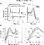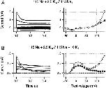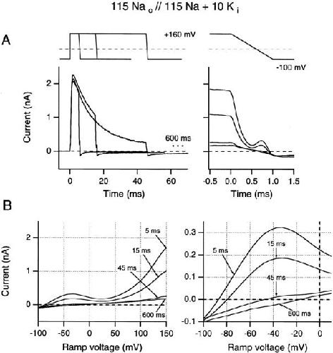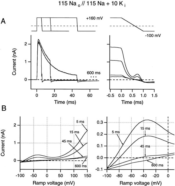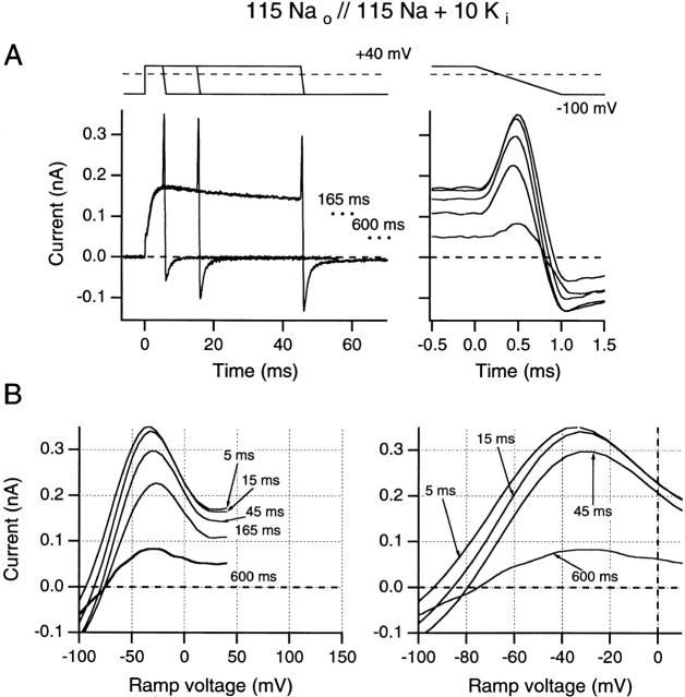 Figure 6. Effects of increasing test pulse duration on ramp I-V curves recorded after test pulses to +160 mV. (A) Ramp currents are plotted against time. (B) Ramp currents are plotted against ramp potential. Same format as in Fig. 5. All data are from the same inside-out patch as in Fig. 5.
