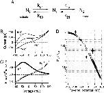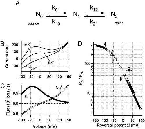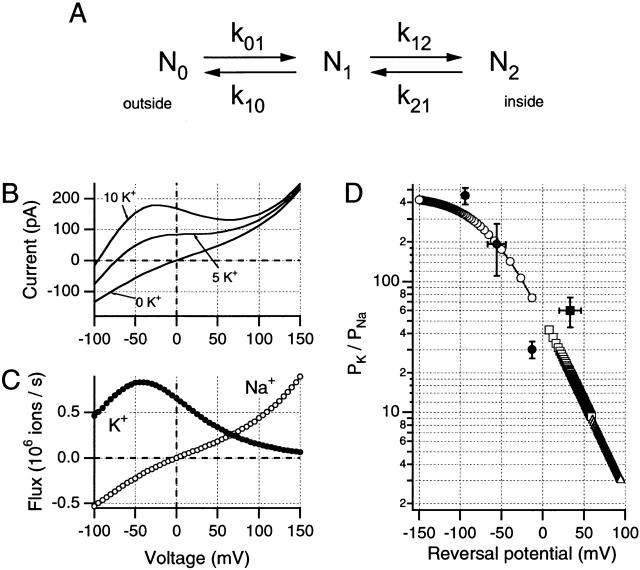 Figure 8. A simple single-site Eyring barrier model can be used to demonstrate voltage-dependent changes in PK/PNa ratio. Parameters of the model used here can be described in relation to a simple kinetic scheme (A) in which N0, N1, and N2 represent the external, intramembrane, and internal energy wells, respectively; where k01 and k10 are the forward and backward rate constants between N0 and N1, and k12 and k21 are the equivalent rate constants between N1 and N2. Values for these rate constants are shown given for both Na+ and K+ ions at 0 mV and the solutions used for the data in Fig. 7 A. Rate constants (sâ1): (Na+) k01, 2.77 à 10+8; k10, 1.13 à 10+5; k12, 2.05 à 10+8; k21, 5.01 à 10+11; (K+) k01, 1.84 à 10+11; k10, 4.57 à 10+8; k12, 6.18 à 10+7; k21, 2.49 à 10+11. To calculate the rate constants at other potentials, it is necessary to define the placements of the barriers and wells within the transmembrane field. For the model used here, N0 and N2 were presumed to be at 0 and 100% of the electrical distance from the external side of the membrane, while N1 was set at 45% of this distance. Internal and external energy barriers were placed at 10 and 90% of the transmembrane field, respectively. (B) Simulations of changes in internal K+ concentrations approximate the data shown in Fig. 7 A, when the same internal and external solutions are used. For this simulation, the patch was presumed to contain 1,500 channels. (C) Predicted single-channel Na+ and K+ fluxes were generated by this model for the 10-mM internal K+ condition, suggesting voltage-dependent changes in relative permeabilities. (D) PK/PNa ratios obtained from predicted reversal potentials for this model under different ionic conditions. (â) Simulations with 115 Nao//115 Nai and differing internally, (â¡) variable external [K+]. âµ were obtained from simulations using internal 11.5 mM Na+, external 115 mM Na+, and variable K+. Experimental values obtained in this study are shown as filled symbols (mean ± SD): â¢, Na+o//Na+i + variable K+; âª, Na+o + 2.5â10 mM K+o//Na+i.