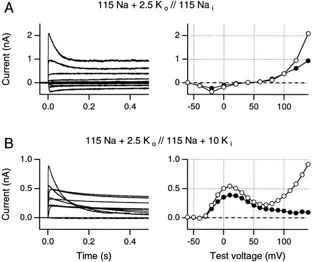 Figure 3. Current families were obtained using a K+-free internal Na+ solution (A) and, in a different patch, following addition of 10 mM internal K+ (B). Holding potential was −80 mV and currents were recorded using on-line −P/n protocols for leak and capacity current subtraction. Test pulse voltages increased by 20-mV increments in A and by 10-mV increments in B. (A) In the absence of internal K+ ions, all outward currents are carried by Na+ ions. Both peak Na+ currents (○) and steady state outward Na+ currents (•) increase steeply at potentials greater than +80 mV. Inactivation becomes readily apparent only at the most positive potentials. (B) In the presence of internal K+ ions, peak currents (○) increase to a maximum at +10 mV, followed by a region of negative slope conductance between +20 and +70 mV. At potentials greater than +80 mV, peak currents rise steeply again, just as in A. However, end currents fall steadily at potentials greater than +10 mV (•). Symbols are connected by straight lines. Data in A and B were obtained from two different inside-out patches. All traces recorded using 5-s interpulse intervals.