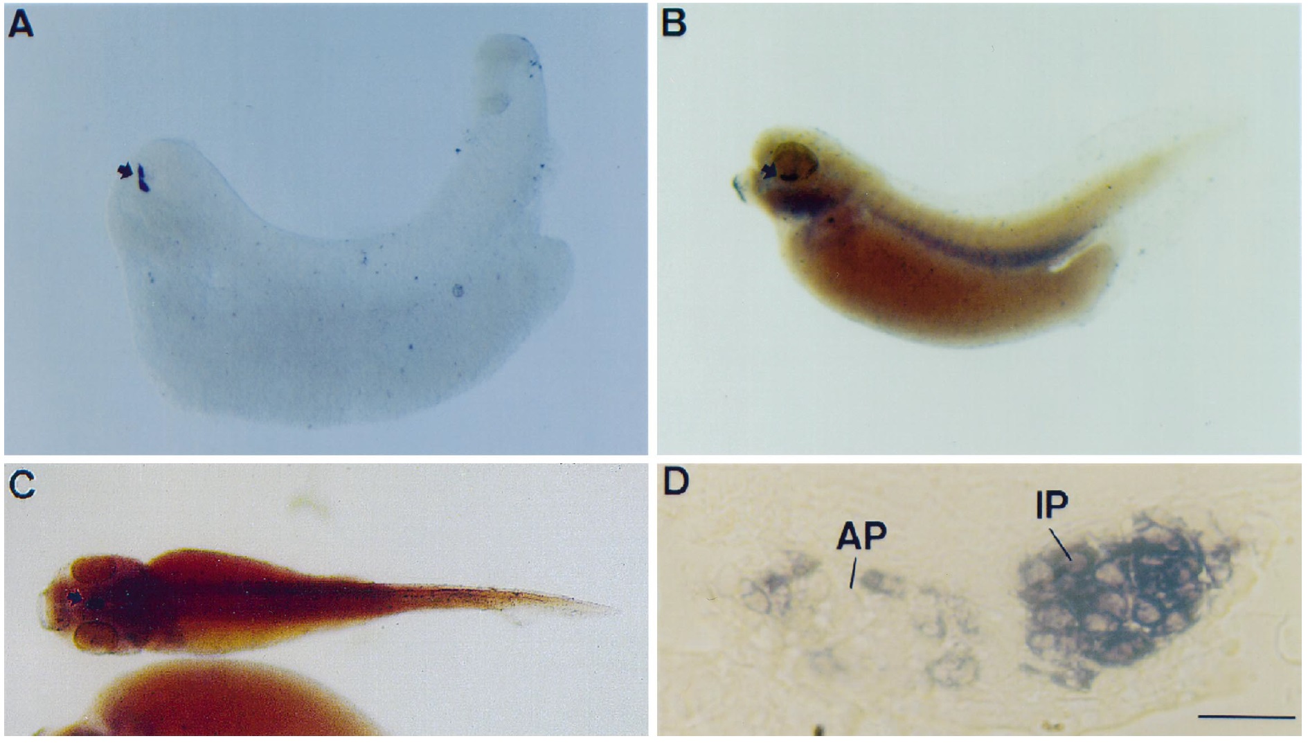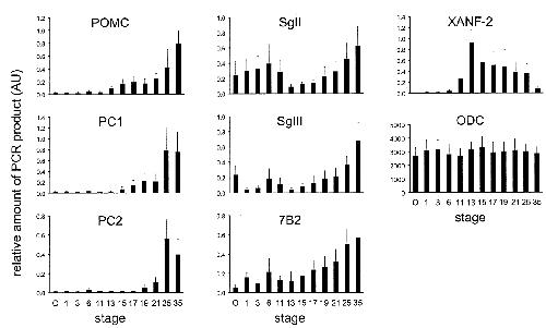 The production of peptide hormones through proteolytic cleavage of prohormones, e.g., proopiomelanocortin (POMC), involves a number of regulated secretory proteins, such as prohormone convertase PC1, PC2 and granin family members, that are co-expressed with the prohormone. Although the expression of these proteins has been well-studied in adult animals, data on their expression during development are limited. We used whole-mount in situ hybridization to visualize POMC mRNA expression in the intermediate and anterior pituitary of Xenopus tadpoles. A more sensitive analysis, namely semi-quantitative reverse-transcription polymerase chain reaction (RT-PCR) on total RNA isolated from Xenopus developmental stages, revealed that the expression of POMC, PC1 and PC2 mRNA commenced at stages 13 (neural plate stage), 15 (neural fold stage) and 19 (neural tube stage), respectively, with a gradual increase in their expression levels during further development. Surprisingly, and in contrast to what holds for POMC and the convertases, mRNAs for secretogranin II and III (SgII, SgIII) and 7B2 were not only expressed during neural development, but could already be detected in unfertilized mature oocytes, the first cleavage stages and in blastula-stage embryos. These granins are thus maternally present in Xenopus embryos suggesting that they may have a role during oogenesis and/or early embryonic development.