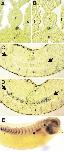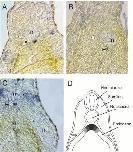 (C) Stage 24. The mostdorsal cell is now flattened against the dorsalmost periphery of the endodermal epithelium and lies at an angle to the adjacent columnar endoderm cells. (D-F) Traced outlines of sections A-C showing position of the prehypochord cell (blue) within the dorsal endoderm. n, notochord; arrow, prehypochord cell.