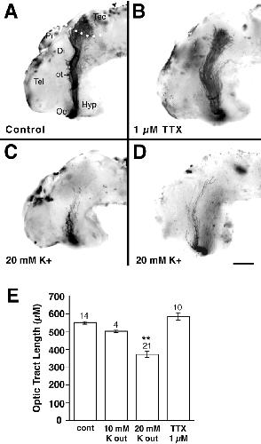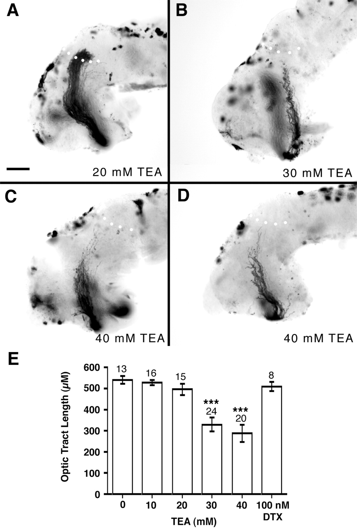 TEA treatment inhibits growing RGC axons.A–D, HRP-labeled optic projections in stage 40 whole-mount brains exposed at stage 33/34 to 20 mM(A), 30 mM (B), and 40 mM (C, D) TEA. Increasing concentrations of TEA result in shorter optic projections, but no obvious pathfinding or fasciculation errors. Scale bar (shown inA), 100 μm. E, Graph showing the mean optic tract length (converted to micrometers from BRUs) with increasing doses of TEA. Low concentrations of TEA (10–20 mM) had little or no effect on the optic projection, whereas the optic tract was significantly shorter in brains exposed to either 30 or 40 mM TEA (***p < 0.001). α-dendrotoxin at a concentration of 100 nM had no effect on the extension of optic axons (p > 0.5).Numbers above bars represent numbers of embryos.