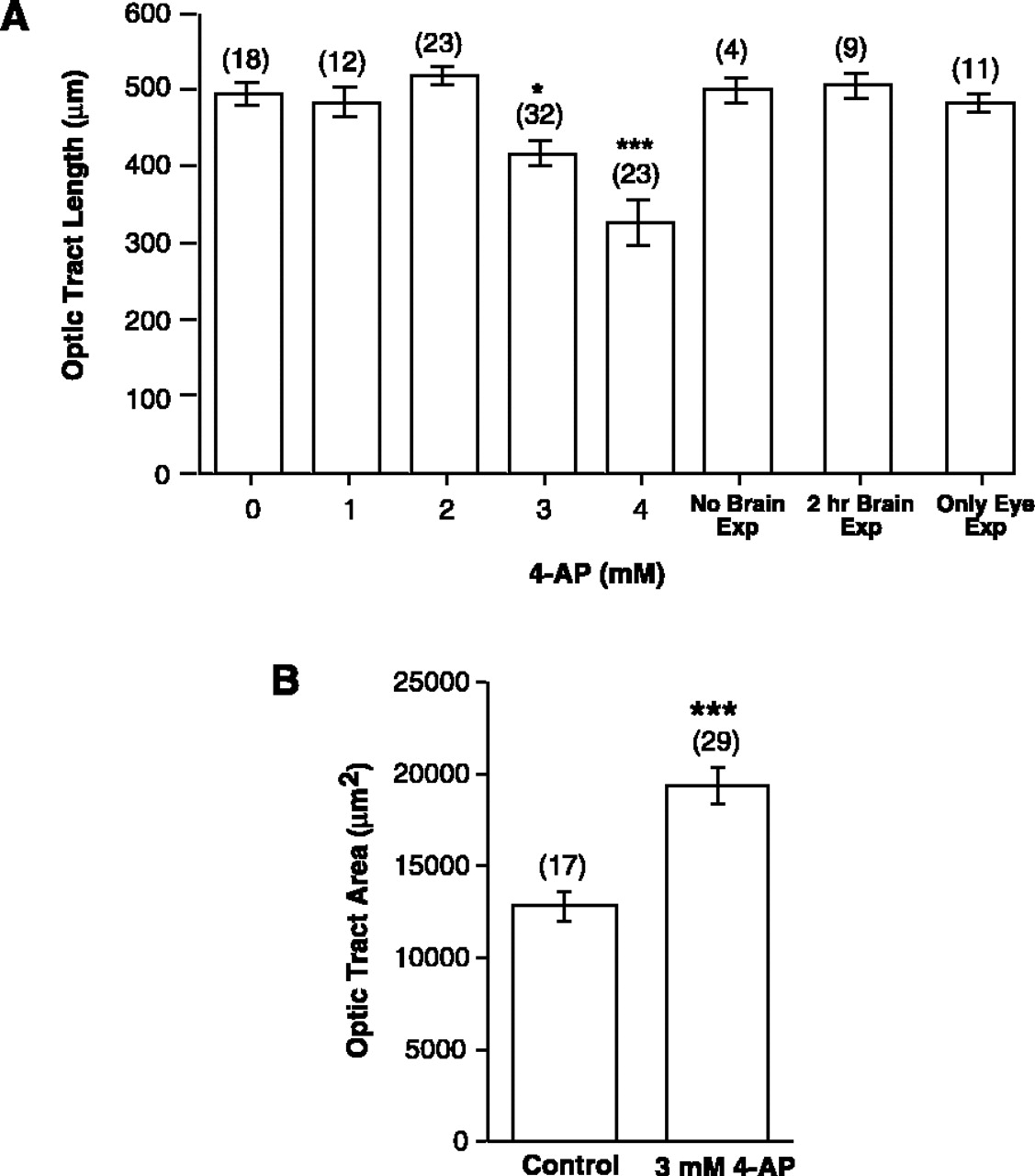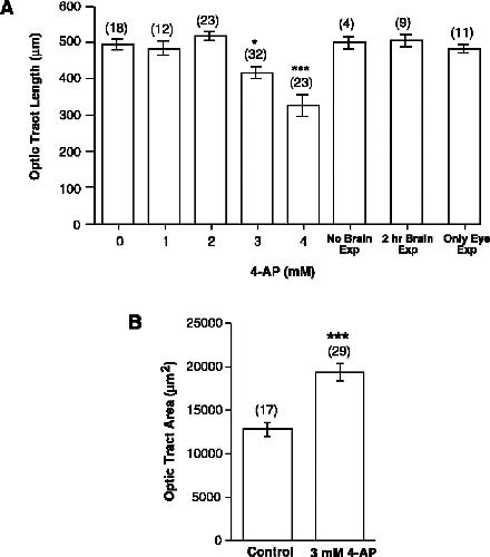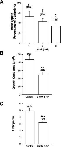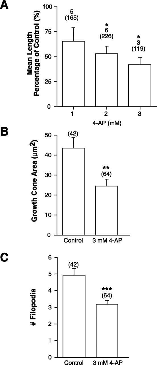 4-AP directly impairs axon extension in culture.A, Graph showing the mean length of the longest neurite of retinal cells treated with 1, 2, or 3 mM 4-AP as a percentage of the mean length in sister control cultures.Numbers above parentheses are the number of separate experiments, whereas the amount in theparentheses represents the number of neurites measured. Error bars indicate SEM (*p < 0.05; unpaired ANOVA; Dunnett's post hoc analysis). B,Graph showing the mean area of the growth cones of retinal cells treated with 3 or 4 mM 4-AP as compared to control growth cones. Growth cone area consisted of the area occupied by the lamellopodia and growth cone body (**p < 0.01, two-tailed Student's t test). C, Graph showing the mean number of filopodia of control and 3 mM4-AP-treated growth cones. Numbers inparentheses are the number of growth cones analyzed (***p < 0.001; MannâWhitney Utest). Data in B and C are from one experimental set, although similar results were observed in two additional independent trials.