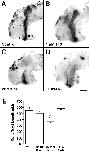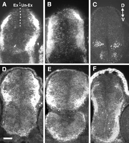4-AP treatment does not grossly affect the patterning or morphology of the neuroepithelium. Cross sections through the diencephalon/midbrain regions of stage 40 embryos exposed at stage 33/34 to control or 3 mM 4-AP bathing solutions. In all panels the exposed (Ex) side of the brain is on theleft, and the unexposed (Un-Ex) side is on the right. Sections were immunolabeled with markers of the neuroepithelium. A, B, Zn-12 immunolabeling of control (A) and 4-AP (B)-exposed brains. C, Islet-1 immunolabeling of ventral neurons in a 4-AP-treated brain showing that dorsal ventral polarity is maintained. D, E,Immunolabeling of control (D) and 4-AP (E)-treated brains with a rabbit polyclonal pan-trk antibody. F, Immunolabeling of a 4-AP-treated brain with a radial glial cell marker (3CB2). D, Dorsal;V, ventral. Scale bar (shown in D), 100 μm.