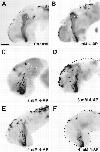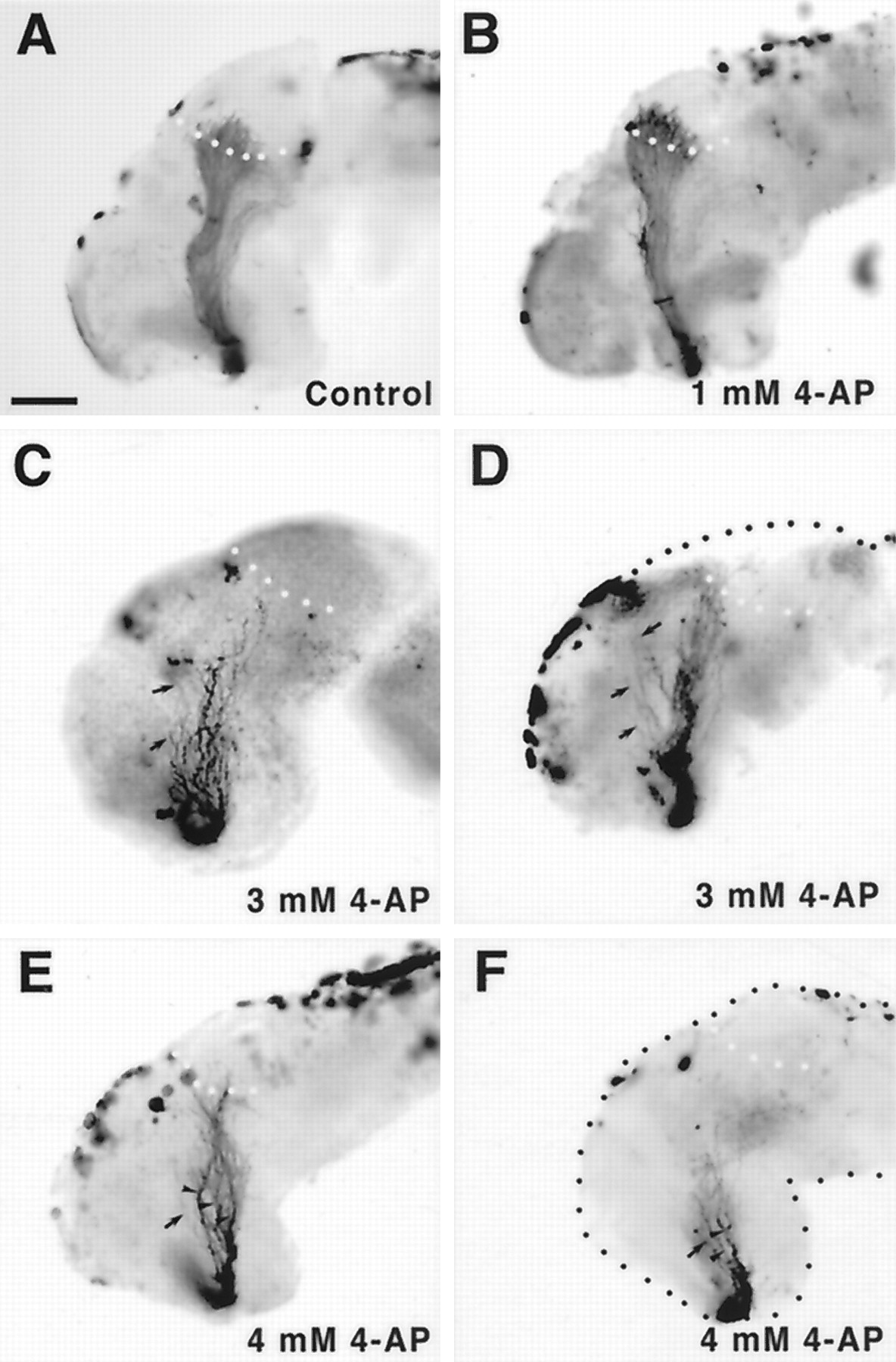 4-AP disrupts the optic projection.A–F, Whole-mount brain preparations showing HRP-labeled optic projections in control (A) and 4-AP-treated (B–F) brains. At a low concentration of 4-AP of 1 mM (B), optic axons behave normally. Optic projections exposed to higher levels of 4-AP, 3 mM (C, D) and 4 mM (E, F), are shorter than control, appear defasciculated (arrowheads), and have many axons that grow aberrantly away from the optic tract (arrows). Scale bar (shown inA), 100 μm.