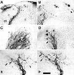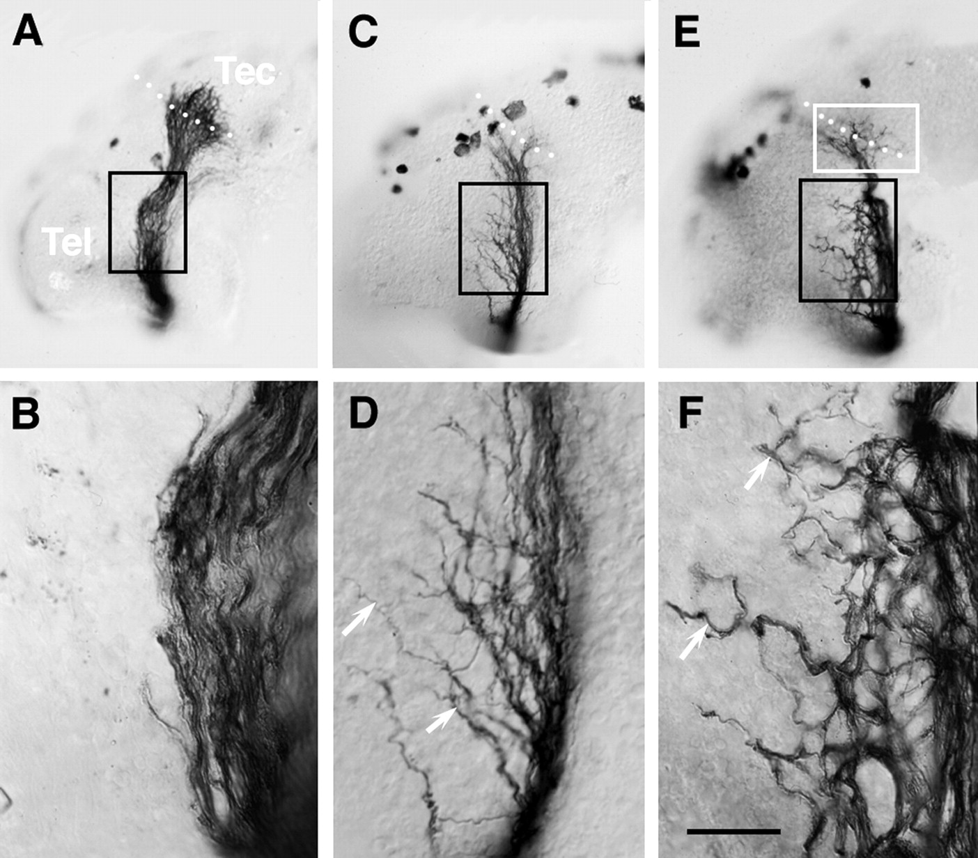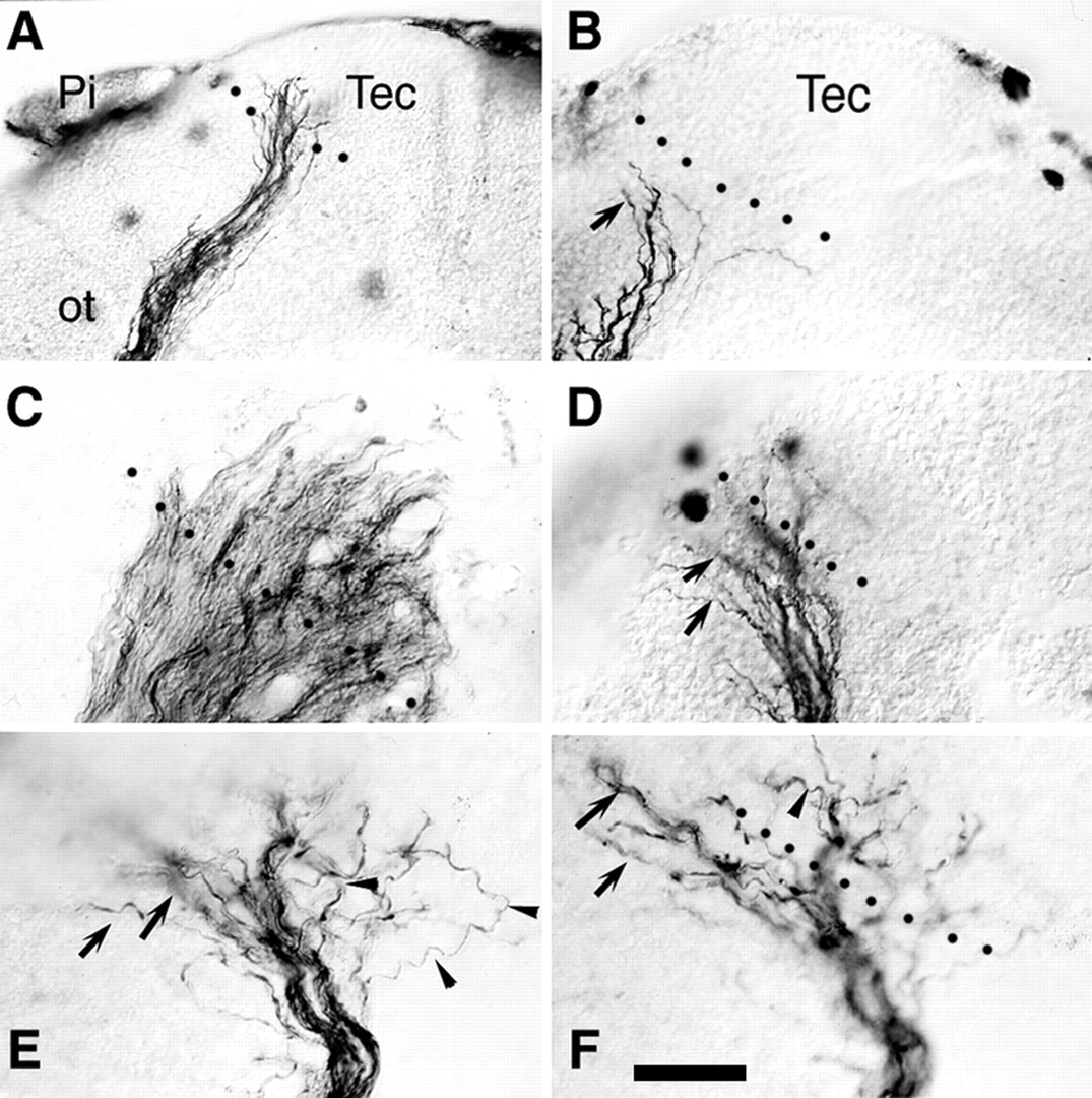 Mistargeting of 4-AP-treated axons. Nomarski images of control (A, C) and 4-AP treated (B, D–F) HRP-labeled optic projections. A, B, Control (A) and 3 mM4-AP-treated (B) stage 37/38 optic projections. The first axons have grown into the optic tectum in control, but turn and avoid the optic tectum in the 4-AP-treated brain (arrow). C–F, Optic projections in the target region of stage 40 embryos. In control, the axons grow into the optic tectum in an orderly manner and begin arborizing (C; Fig. 4 A). Whereas, in 4-AP-treated brains (D–F), axons either fail to enter the optic tectum (arrows) or grow into the target and then grow in an apparently random fashion (arrowheads). E and F are high-power views of different focal planes of thewhite-boxed area in Figure 4 E.Pi, Pineal gland; Tec, optic tectum;ot, optic tract. Scale bar (shown inF): A, B, 100 μm;D–F, 25 μm. Dotted black linesindicate the approximate anterior border of the optic tectum.