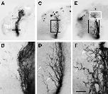 Misrouting of 4-AP-treated axons. Nomarski images of HRP-labeled optic projections in control and 3 mM4-AP-treated brains. A, B, In control, axons grow tightly together in the optic tract as seen at both low (A) and higher (B) magnification. C–F, In contrast, in optic projections exposed to 3 mM 4-AP many axons behave aberrantly.D and F are higher power views of areasboxed in black in C andE, respectively. In both cases, the optic projection appears defasciculated. Moreover, many axons grow aberrantly into regions they normally avoid (arrows). White boxed area represents target area shown at higher power magnification in Figure 6. White dots show the approximate anterior border of the optic tectum. Scale bar (shown inF): A, C, E, 200 μm; B, D, F, 40 μm.