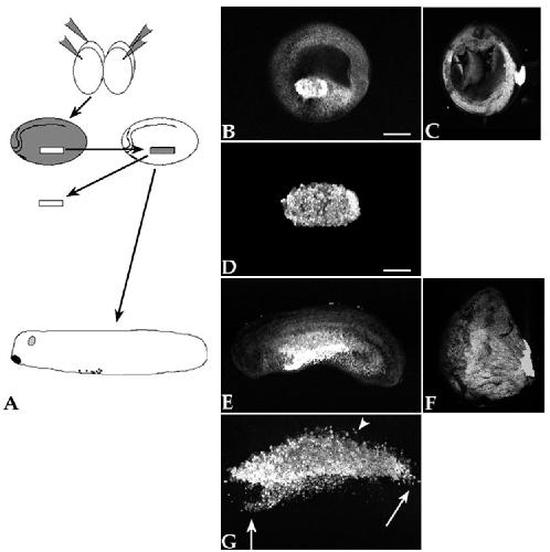 tailbud embryo in E and F showing labeled mesodermal cells separated from the bulk of the transplant in A-P dimension (G, arrows) and