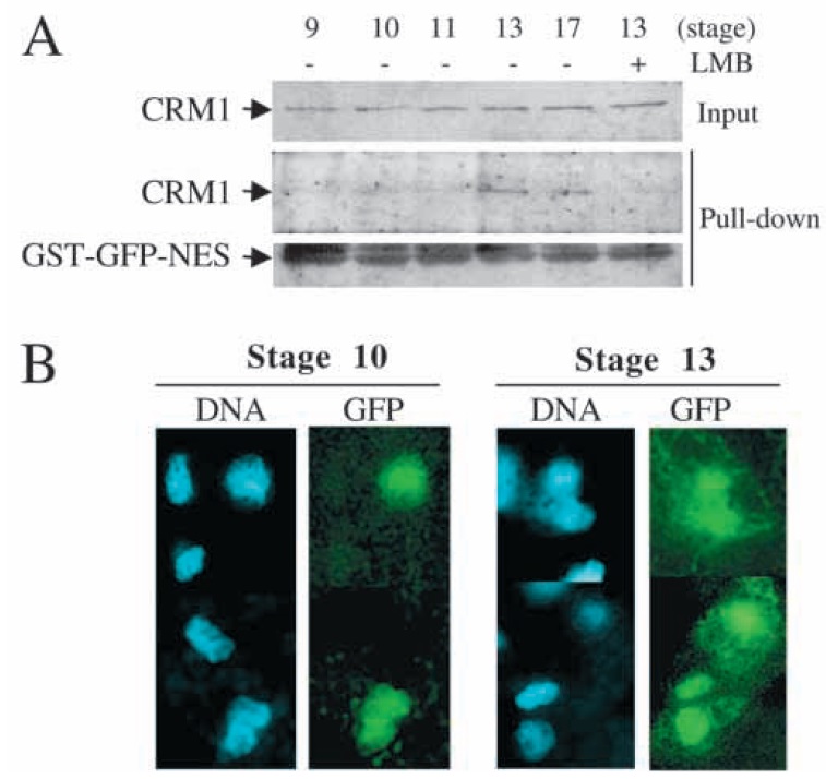 In this work, we have investigated the role of CRM1/XPO1, a protein involved in specific export of proteins and RNA from the nucleus, in early Xenopus embryogenesis. The cloning of the Xenopus laevis CRM1, XCRM1, revealed remarkable conservation of the protein during evolution (96.7% amino acid identity between Xenopus and human). The protein and mRNA are maternally expressed and are present during early embryogenesis. However, our data show that the activity of the protein is developmentally regulated. Embryonic development is insensitive to leptomycin B, a specific inhibitor of CRM1, until the neurula stage. Moreover, the nuclear localization of CRM1 changes concomitantly with the appearance of the leptomycin B sensitivity. These data suggest that CRM1, present initially in an inactive form, becomes functional before the initiation of the neurula stage during gastrula-neurula transition, a period known to correspond to a critical transition in the pattern of gene expression. Finally, we confirmed the gastrula-neurula transition-dependent activation of CRM1 by pull-down experiments as well as by the study of the intracellular localization of a green fluorescent protein tagged with a nuclear export signal motif during early development. This work showed that the regulated activity of CRM1 controls specific transitions during normal development and thus might be a key regulator of early embryogenesis.