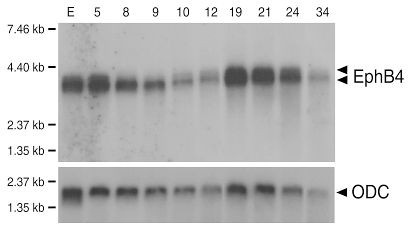 Figure 3. Developmental expression of EphB4 during Xenopus embryogenesis. Northern blot of polyadenylated RNA isolated from unfertilized eggs (E) and various embryonic stages (st. 54) was hybridized with a cDNA probe encoding the extracellular and transmembrane domains of EphB4a. Two EphB4 transcripts are indicated. In the lower panel, the same blot was re-probed with ornithine decarboxylase (ODC) to control for equal RNA loading. The positions of RNA molecular weight markers are shown to the left of the blots.