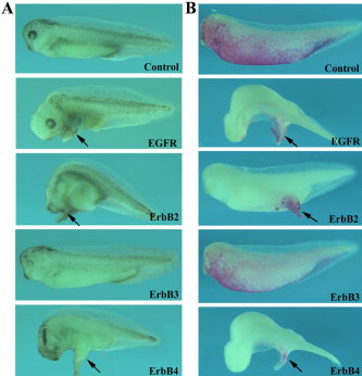 Figure 2. Overexpression of EGFR, ErbB2, and ErbB4 induces ectopic protrusions. RNAs encoding ErbBs were injected into the animal poles of 2-cell stage embryos and the resulting tadpoles were examined at stages 34â38. A: EGFR (1 ng), ErbB2 (500 pg), and ErbB4 (500 pg), but not the kinase-defective ErbB3 (2 ng), induced ectopic protrusions when overexpressed in the ectoderm of early frog embryos. B: Lineage tracing with nuclear beta-galactosidase (200 pg RNA) indicated that ErbBs induced ectopic structures cell-autonomously. Black arrows point to the ectopic structures. All embryos were oriented with anterior to the left. |