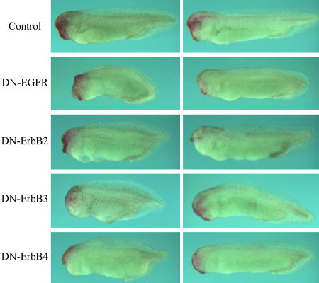 Figure 7. Inhibition of ErbB signaling in the head ectoderm leads to malformation of the head structures. RNAs encoding DN-ErbBs (1 ng) were coinjected with the lineage tracer nβGal (200 pg) into one animal blastomere of 16- to 32-cell stage embryos. This targeted expression of DN-ErbBs in the ectoderm greatly reduced the incidence of gastrulation defects. The resulting tadpoles (stages 32â36) were stained with the Red-Gal substrate and the embryos with the labeling in the head were scored for their head morphology. While the majority of nβGal-injected embryos showed normal head phenotype, more than half of the embryos injected with DN-ErbBs displayed malformation of the head structures, including reduction of the eyes and the forebrain. The data suggest that ErbBs may regulate head development directly independent of their effects on gastrulation. |