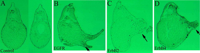 Fig. 3. ErbBs stimulate cell proliferation in the ectopic protrusions. RNAs encoding ErbBs were injected into the animal poles of 2-cell stage embryos as in Figure 2, and the resulting tadpoles (stages 32â36) were analyzed by whole mount immunohistochemistry with anti- phosphorylated histone H3 antibody for detection of mitotic cells. Transverse microtomal sections of the embryos are shown here, with the dorsal side up. While most mitotic cells were scattered in wild type embryos, a dramatic increase in mitotic cells was seen in the ectopic protrusions induced by overexpression of EGFR, ErbB2, and ErbB4 (compare B, C, and D with A; black arrows, ectopic structures). Cell counting indicated that there was an average of 8-fold increase in mitotic cells in the protrusions. |