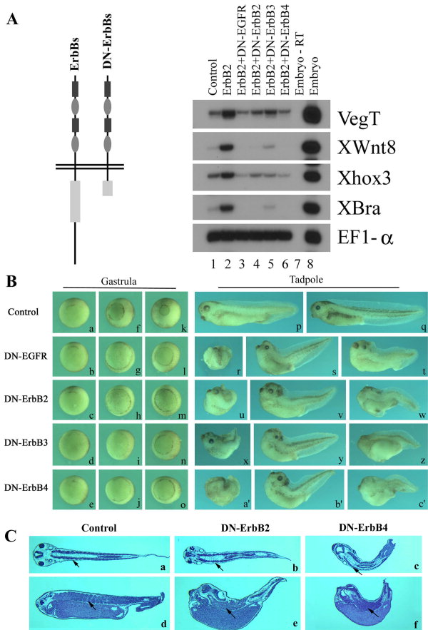 ErbB signaling has long been implicated in cancer formation and progression and is shown to regulate cell division, migration, and death during tumorigenesis. The functions of the ErbB pathway during early vertebrate embryogenesis, however, are not well understood. Here we report characterization of ErbB activities during early frog development. Gain-of-function analyses show that EGFR, ErbB2, and ErbB4 induce ectopic tumor-like cell mass that contains increased numbers of mitotic cells. Both the muscle and the neural markers are expressed in these ectopic protrusions. ErbBs also induce mesodermal markers in ectodermal explants. Loss-of-function studies using carboxyl terminal-truncated dominant-negative ErbB receptors demonstrate that blocking ErbB signals leads to defective gastrulation movements and malformation of the embryonic axis with a reduction in the head structures in early frog embryos. These data, together with the observation that ErbBs are expressed early during frog embryogenesis, suggest that ErbBs regulate cell proliferation, movements, and embryonic patterning during early Xenopus development.