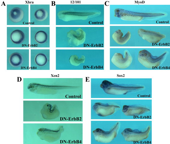 Fig. 8. Blocking the ErbB pathway affects the pattern of marker gene expression. RNAs encoding DN-ErbB2 or DN-ErbB4 (total 2ng) were injected into the marginal zones of 4-cell stage embryos, and marker gene expression was examined by in situ hybridization or immunohistochemistry at gastrula (stages 11â12) or tadpole (stages 36â40) stages. A: Inhibition of ErbB signaling does not lead to repression of early pan-mesodermal gene Brachyury (Xbra) expression, though the delay in gastrulation results in larger blastopore in embryos injected with DN-ErbBs. The embryos are at stages 11â12 and viewed from the vegetal side. B: The muscle marker 12/101 epitope was expressed in embryos expressing DN-ErbBs, but the repeated expression pattern of the epitope in distinct somites was not apparent. C: In situ hybridization with the MyoD probe illustrated that expression of MyoD in embryos injected with DN-ErbBs was reduced, and the reiterated pattern of expression in each somite was indistinct. D: The neural marker Xen2 epitope was expressed in the trunk region in embryos expressing DN-ErbBs, but the forebrain and the brachial arch neuronal expression domains were missing. E: The pan-neural marker Sox2 was expressed at normal levels in embryos injected with DN-ErbBs at gastrula stages (not shown); at tadpole stages, its expression in the head region was severely reduced, though the trunk expression was relatively normal. The embryos in BâE are orientated with the head on the left side. |